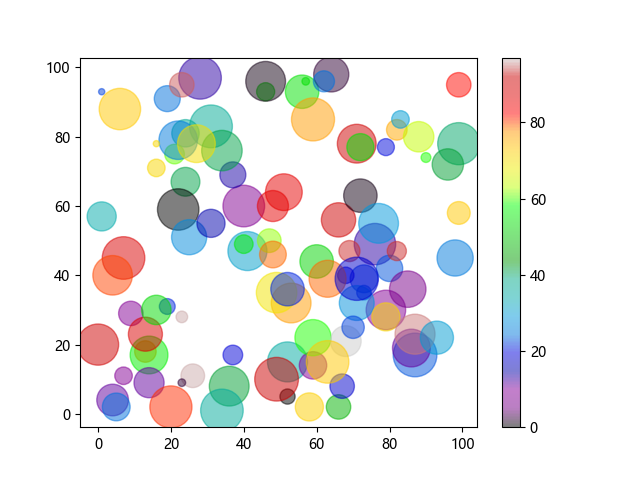 # 以下三行代码使编译器支持绘图功能: import sys import matplotlib matplotlib.use('Agg') import matplotlib.pyplot as plt import numpy as np # 生成随机数据: x = np.random.randint(100, size=(100)) y = np.random.randint(100, size=(100)) colors = np.random.randint(100, size=(100)) sizes = 10 * np.random.randint(100, size=(100)) # 点大小(10-990随机值) # 使用光谱配色、半透明效果创建散点图: plt.scatter(x, y, c=colors, s=sizes, alpha=0.5, cmap='nipy_spectral') plt.colorbar() plt.show() # 以下两行代码使编译器能够输出图形: plt.savefig(sys.stdout.buffer) sys.stdout.flush()