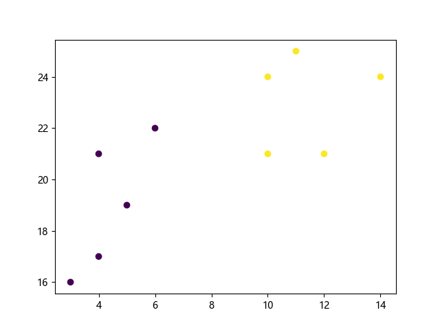 # 这三行代码使编译器能够绘图: import sys import matplotlib matplotlib.use('Agg') import matplotlib.pyplot as plt from sklearn.cluster import KMeans # 定义样本数据: x = [4, 5, 10, 4, 3, 11, 14, 6, 10, 12] # 特征 1 y = [21, 19, 24, 17, 16, 25, 24, 22, 21, 21] # 特征 2 # 组合特征数据: data = list(zip(x, y)) # 创建 K-means 聚类模型(2 个簇): kmeans = KMeans(n_clusters=2) # 训练模型: kmeans.fit(data) # 绘制聚类结果散点图(按簇标签着色): plt.scatter(x, y, c=kmeans.labels_) # 显示图形: plt.show() # 这两行代码使编译器能够输出图形: plt.savefig(sys.stdout.buffer) sys.stdout.flush()